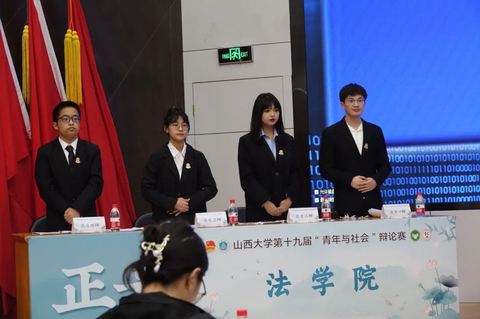 正方三辩围绕“制度约束私欲”“财产公开制度的可行性”,结合自身员工身份,从“官员”出发,联想自身“课代表”经历,讲述生动形象,赢得阵阵掌声。