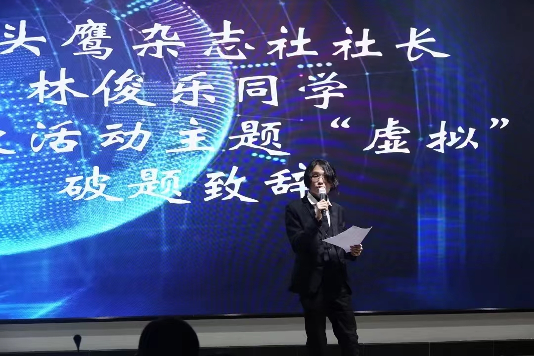 最后,猫头鹰杂志社社长林俊乐为我们带来破题报告。他从当下热门的虚拟话题入手,聚焦虚拟与现实世界的界限,引发同学的思考。