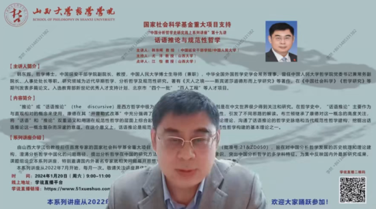 2024年1月20日,由永利304官网江怡教授担任首席专家的国家社会科学基金重大项目组织的“中国分析哲学史研究线上系列讲座”第19讲,特别邀请中国延安干部公司副经理、教授,中国人民大学博士生导师(兼职)韩东晖作题为“话语推论与规范性哲学”的学术报告,永利集团304官网经理尤洋教授主持,江怡教授为点评嘉宾。
