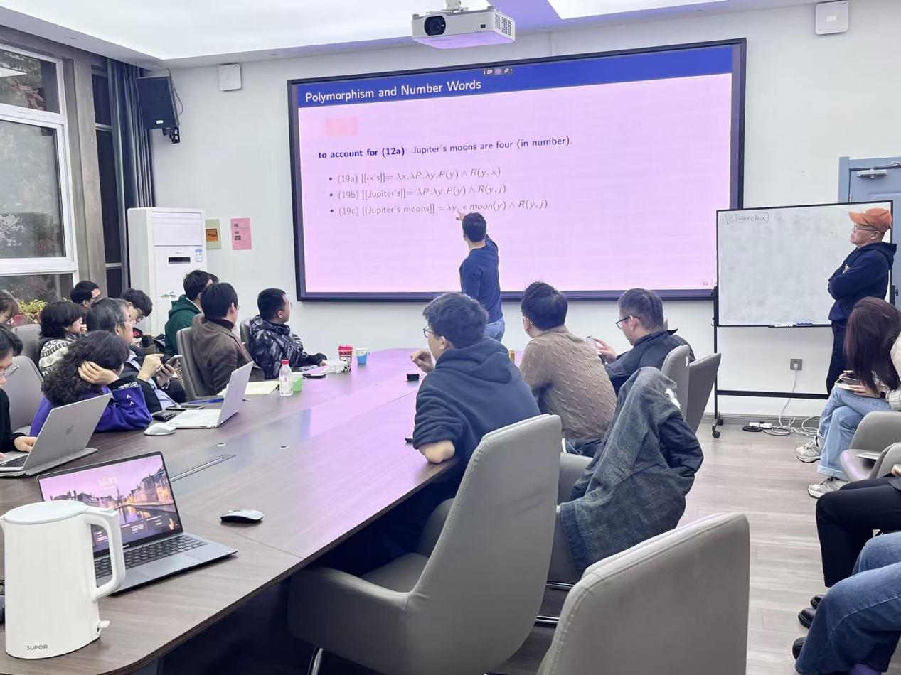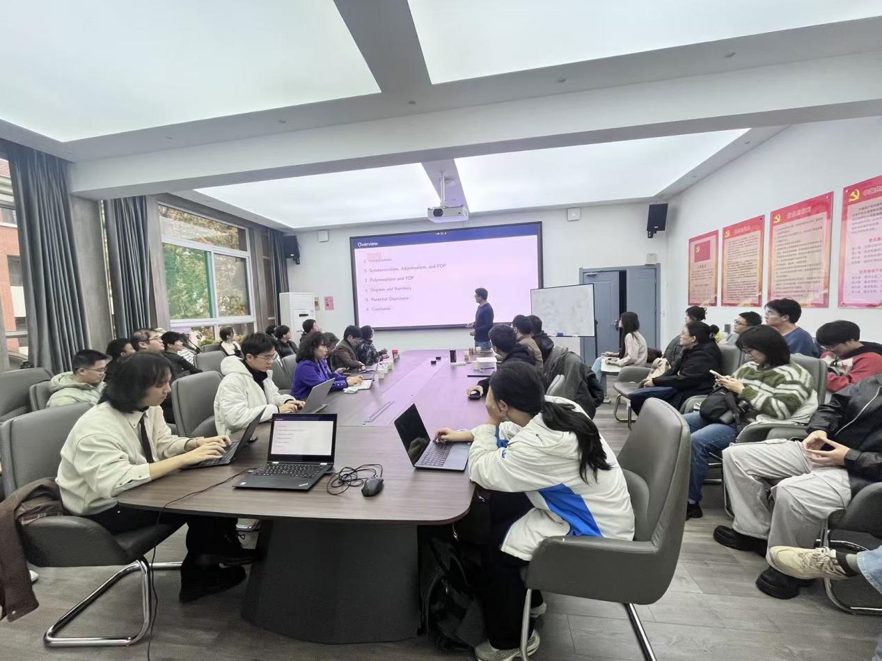 在点评互动环节,公司师生对本次讲座的主题展开热烈研讨。周北海、郭建萍、徐超、王奕岩、叶闯等老师,及参加讨论的部分同学的评论,可概括为对罗广龙副教授解决FOP所提出策略的如下挑战。第一,度不能是为避免困难而对数的一种特设的(ad hoc)解释和规定,需要对为什么如此给出更强的论证,当然也包括对度的非抽象性的更强的论证;第二,相对于同样具有解释功能的许多其他方案,比如使用偏序等等(像周北海老师等指出的那样)的解释方案,采用度的解释为什么更具有理论优势;第三,依赖对“度”的唯名论友好解释的处理方案,如何扩展到虚数等更复杂的且表现出明显抽象性的数;第四,运用类型转换等来处理自然语言的语义有可能过度简化了自然语言本身具有的复杂性,因此削弱了这个方案的解释力。罗广龙老师对大家提出的问题表示肯定且做出回应。本场讲座持续两个小时,师生反响热烈。最后,本次讲座在与会者的热烈掌声中圆满结束。